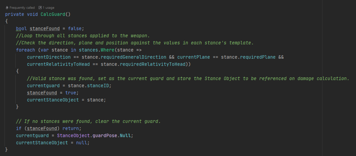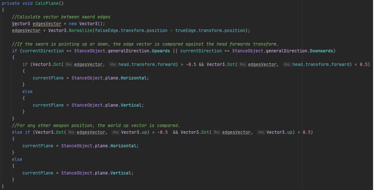 Various elements of the weapon needed to be calculated within the virtual reality game-space to determine the correct guard, these included determining the following; the plane in which the edge of the weapon is held, the direction of the weapon's point and the general position of the weapon relative to the player. With these variables it is possible to then determine whether the weapon is held in a valid stance.